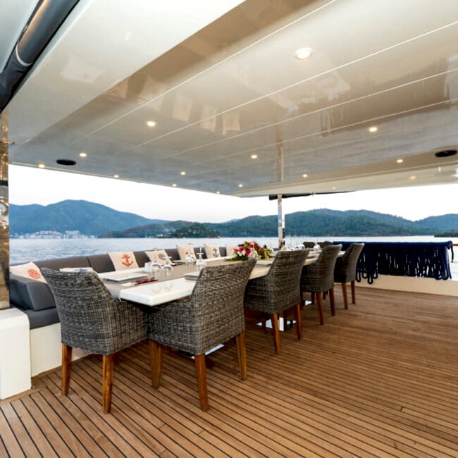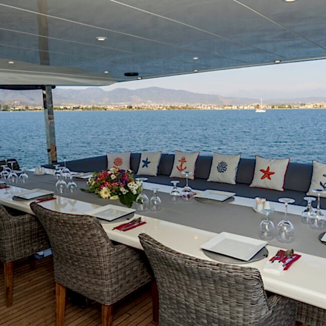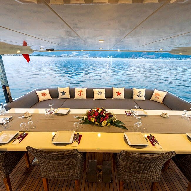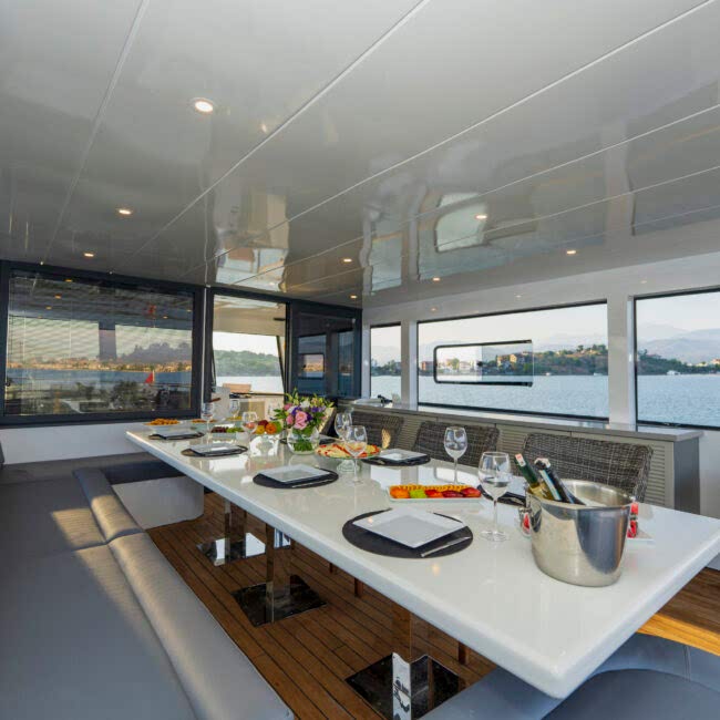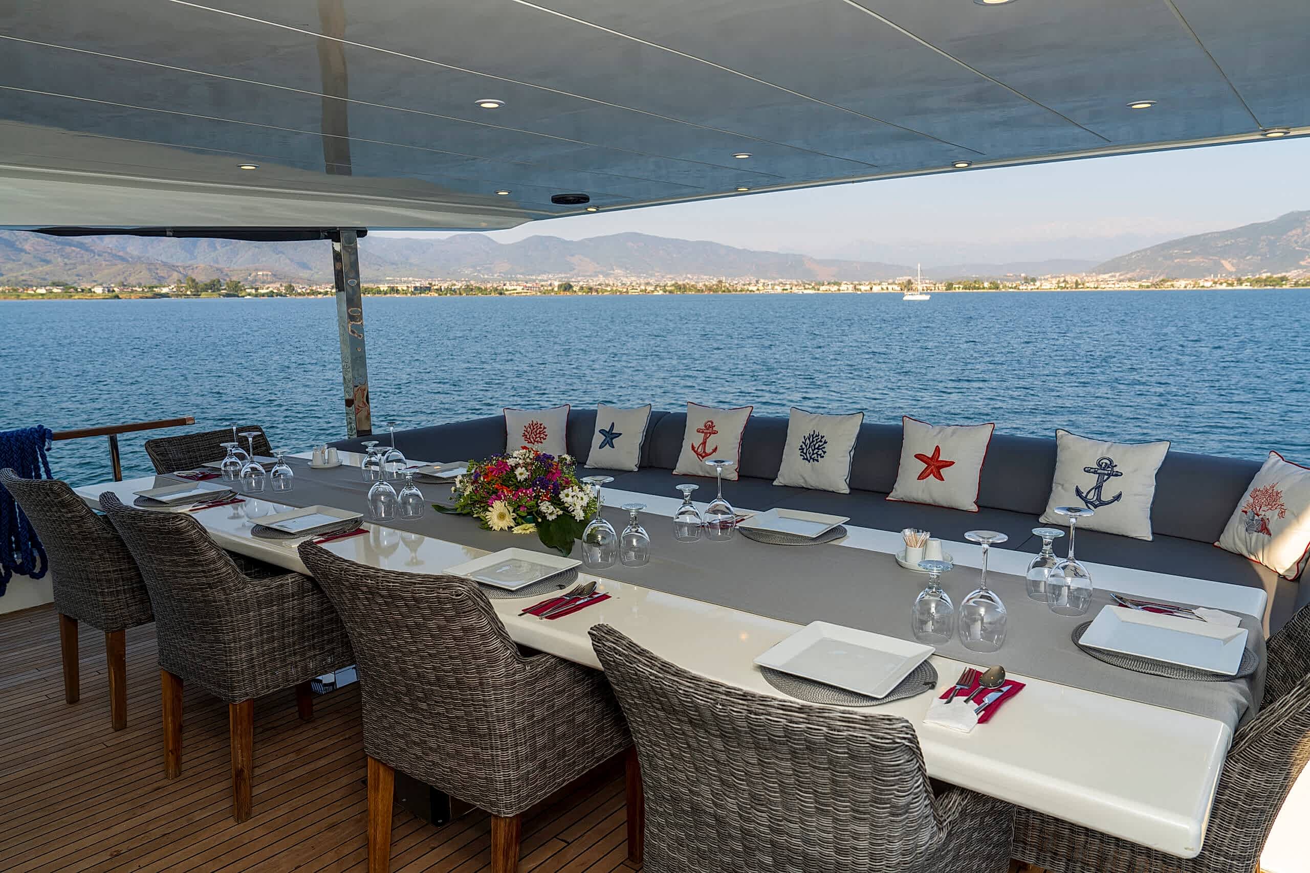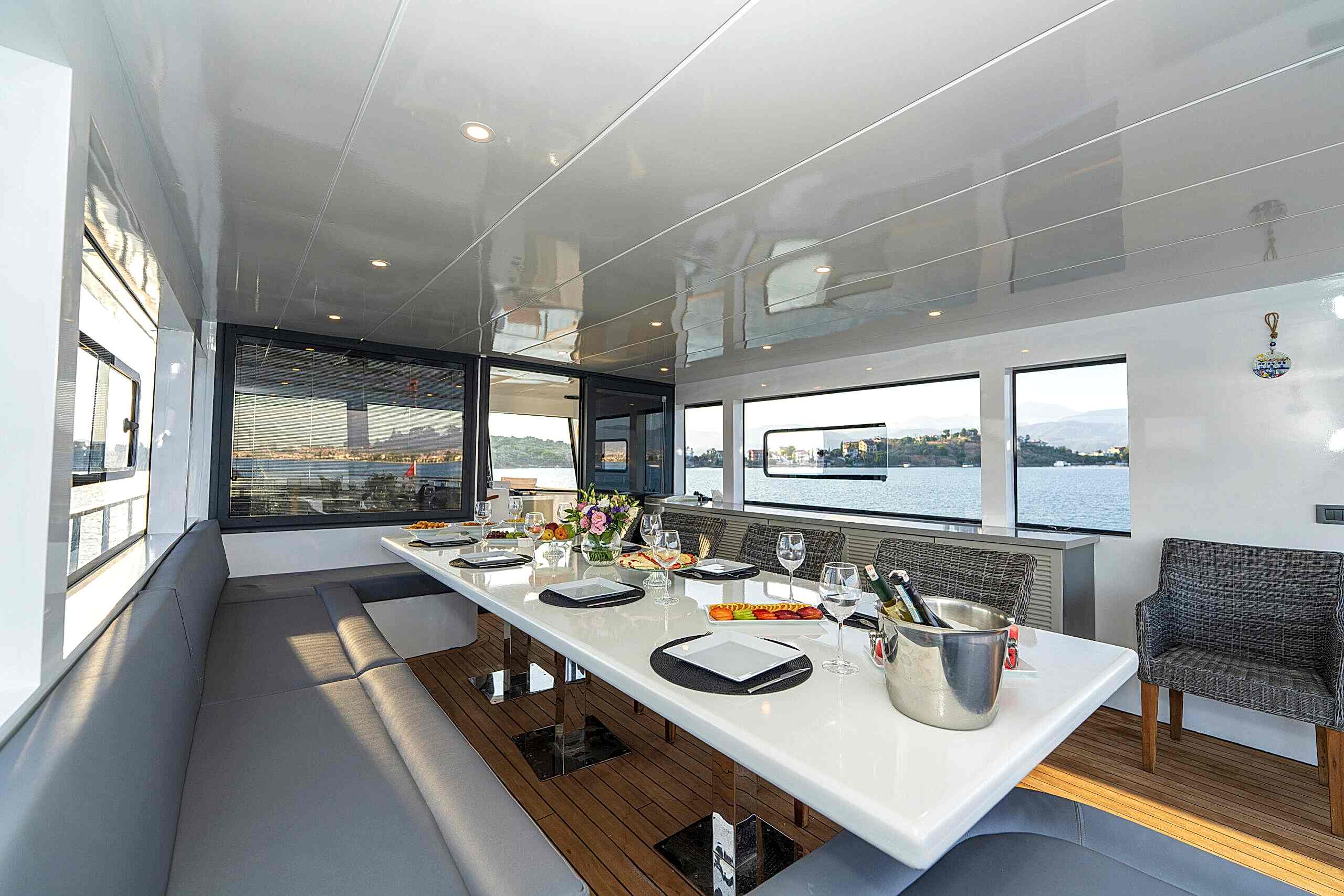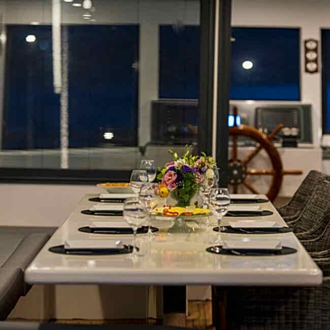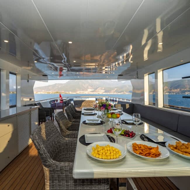 Tam donanımlı mutfağımızda özenle hazırlanan yemeklerimizi güvertede veya salonda bulunan şık masamızda tadabilirsiniz.