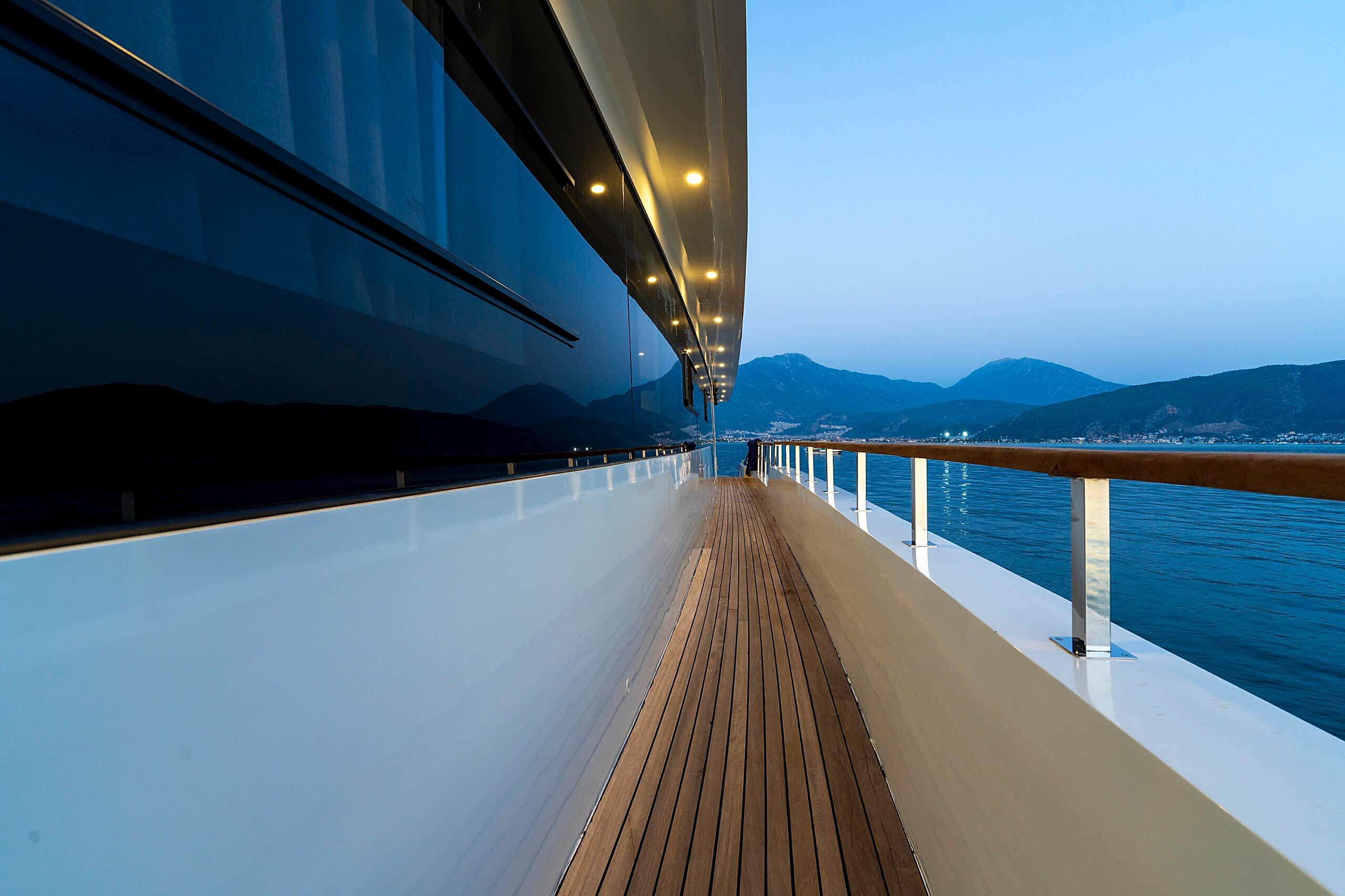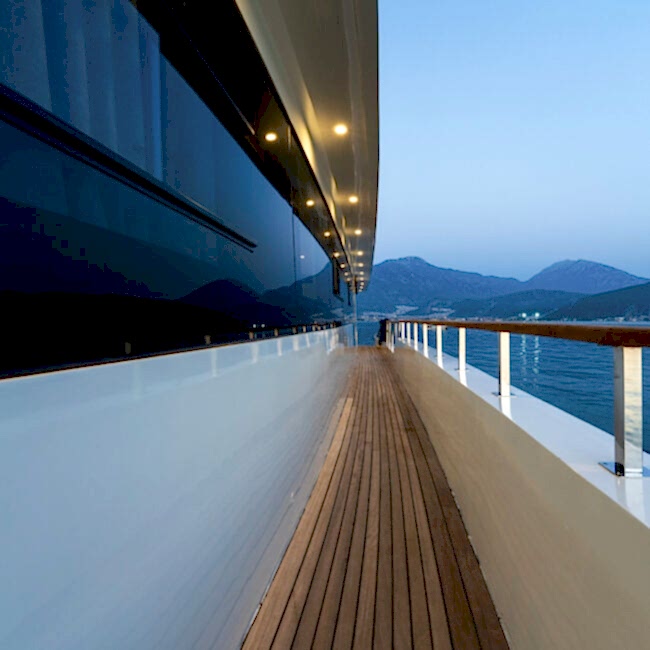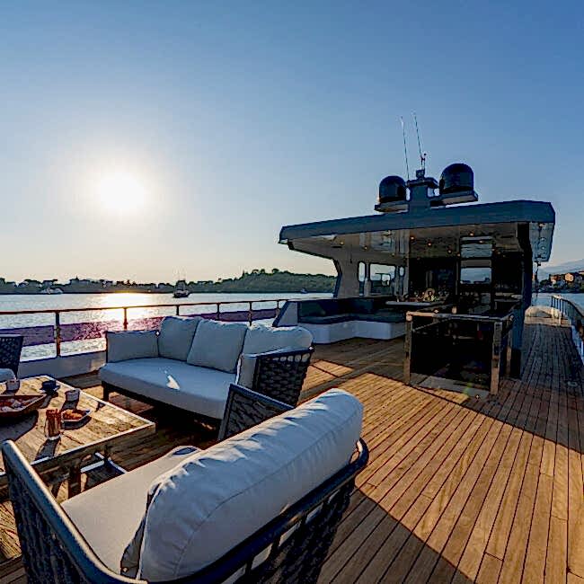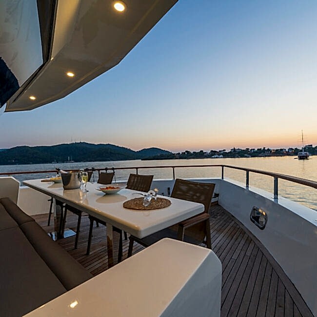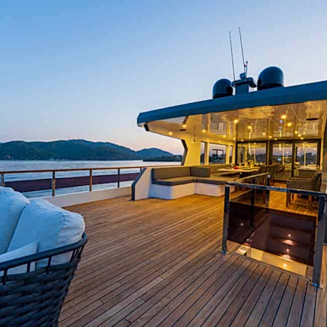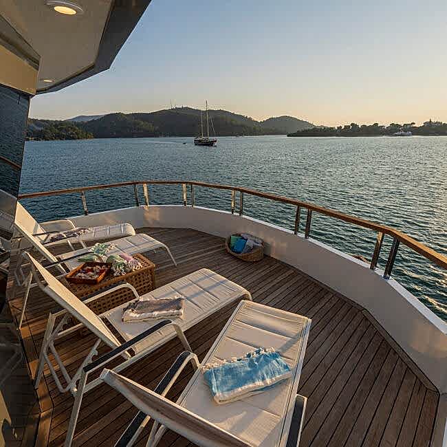 Yatımızın üst tarafında tüm misafirlerimizin güneşlenebileceği geniş ve konforlu güneş yatakları mevcuttur.
