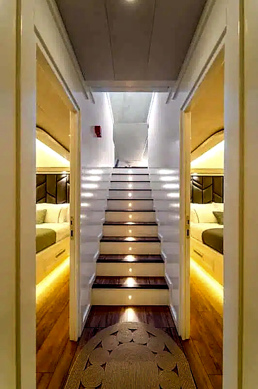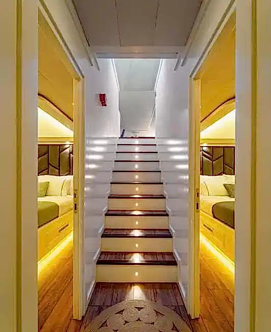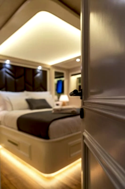 40 metre uzunluğunda, 8.30 metre genişliğindeki süper lüks yat, 2 Master, 3 Double, 1 Twin kabinde toplam 12 misafir ağırlayabilmektedir.
