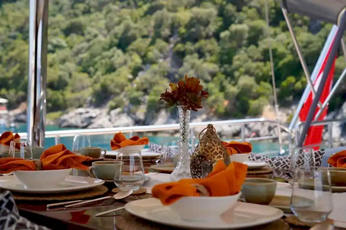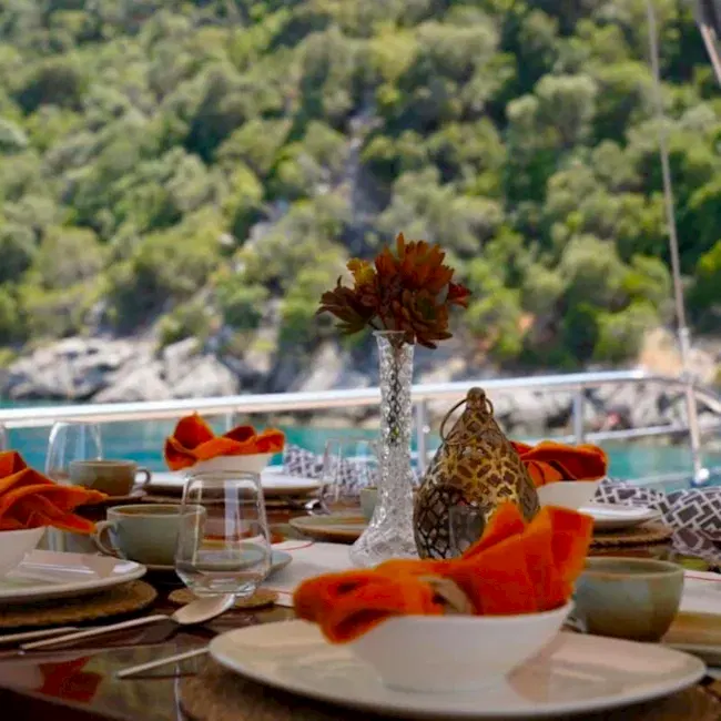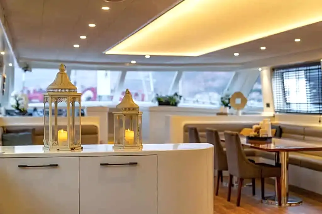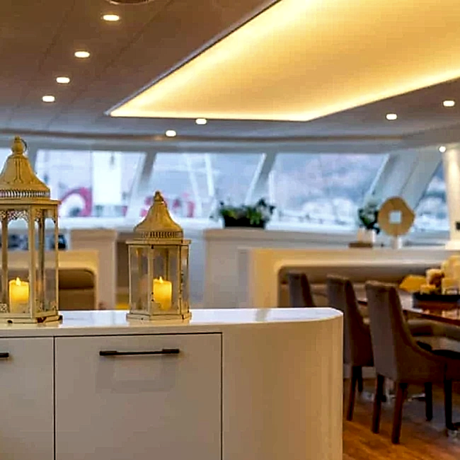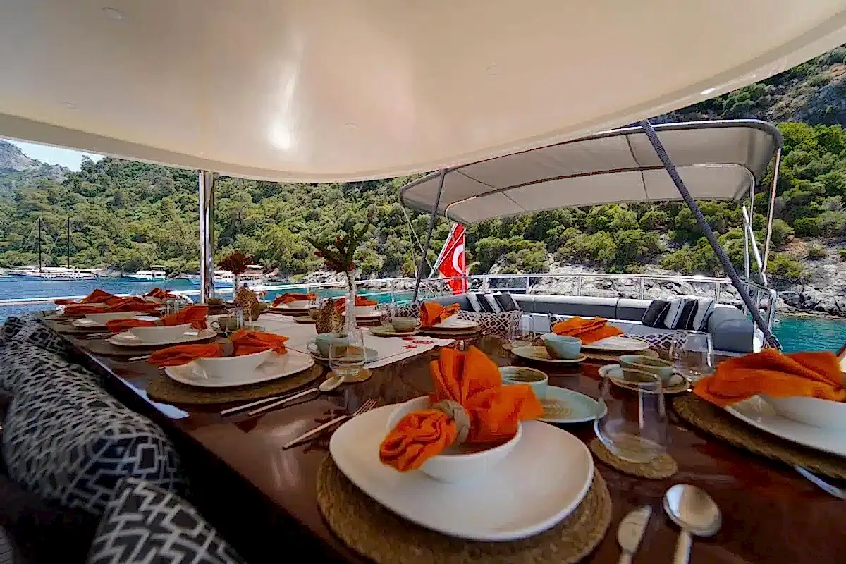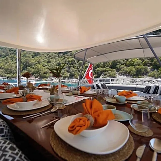 Salonda ve güvertede bulunan yemek masalarına farklı lezzetlerin tadını çıkarabilirsiniz.