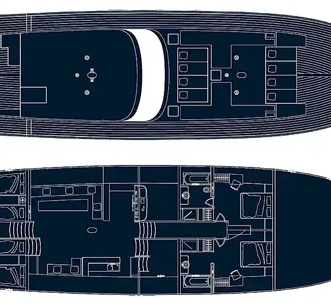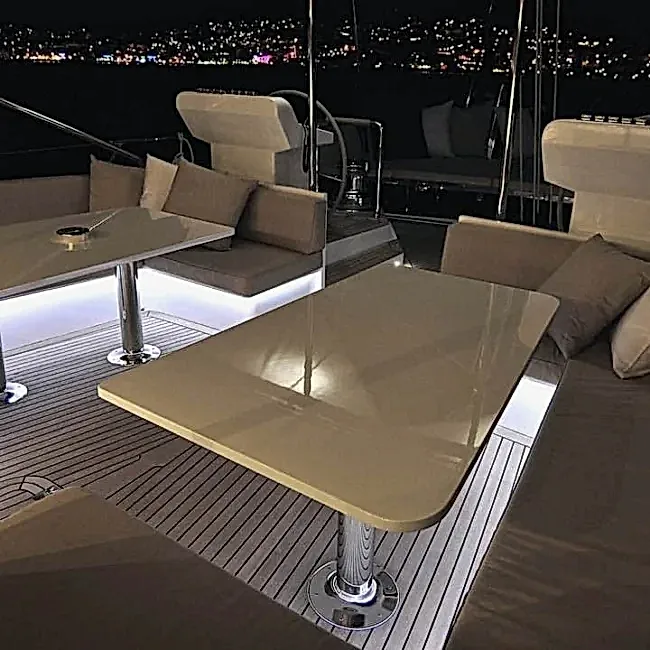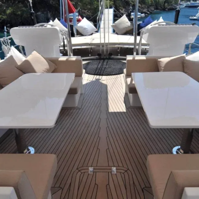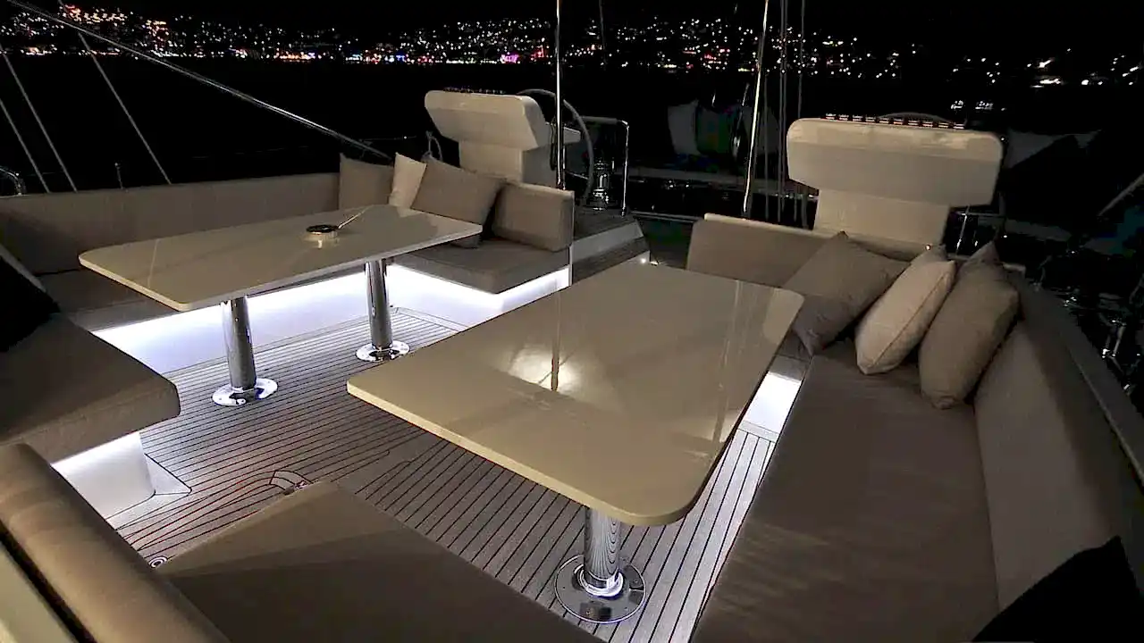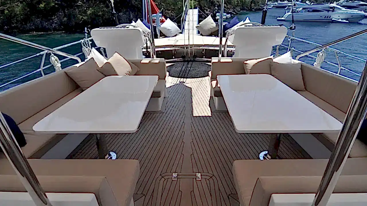 Güvertede 2 dış direksiyon pozisyonu mevcuttur. Arka güverte iki büyük salon güneş alanından, 2 masa ve oturma alanından oluşan bir açık hava yemek odasından, bir ıslak bardan, ses sisteminden ve televizyondan oluşur. Açık gölgeli bir alan sunan geniş peyzajlı köprüyü kaplayan sabit bir tente de vardır.